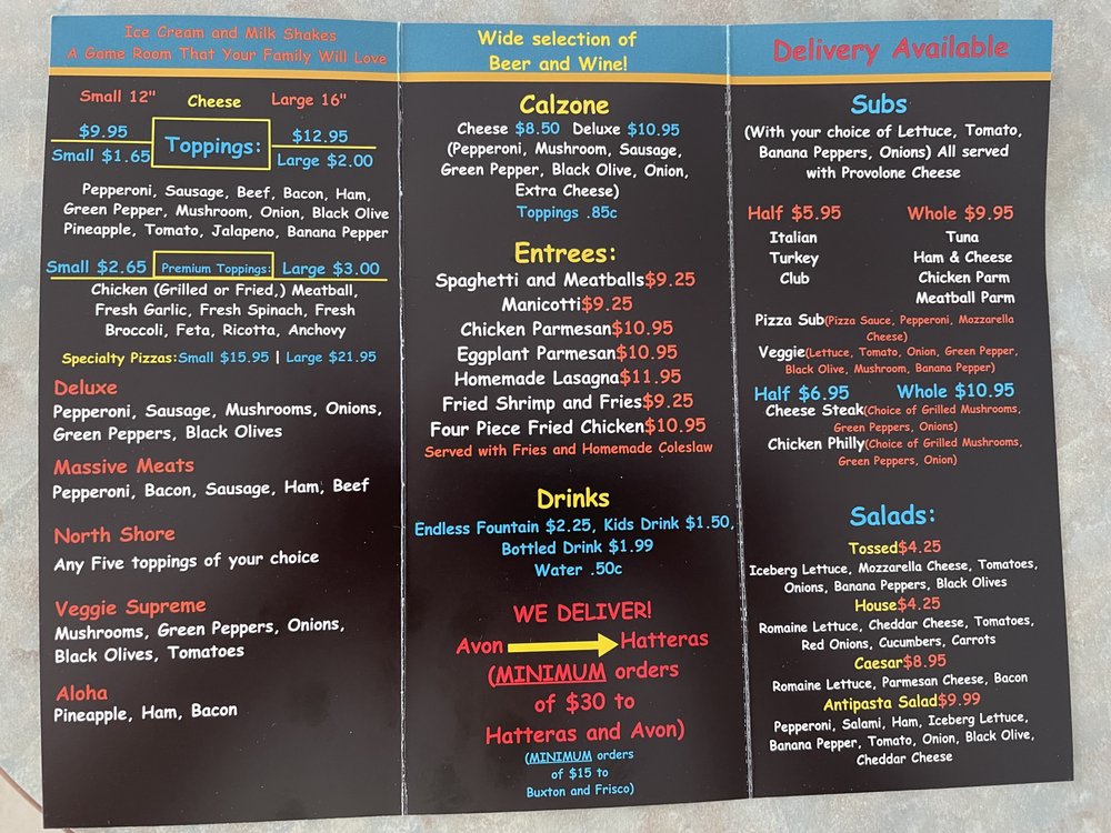 Angelo's Pizza in Buxton, NC offers a variety of options from pizzas, sandwiches, to burgers. Known for their personalized pizzas, subs, and calzones, this casual eatery provides excellent service and quick wait times for takeout orders. Customers rave about the delicious cheesy pizzas and wide range of options including gluten-free choices and loaded subs. The friendly and accommodating staff ensure a pleasant dining experience. Reviewers praise the great French fries and fried pickles, highlighting the fast service and reasonable prices. With ample vegetarian options and a cozy outdoor seating area, Angelo's Pizza is a perfect spot for a family-friendly meal or a group gathering. Located conveniently on NC 12 Hwy, Angelo's Pizza promises a satisfying meal for both locals and vacationers on Hatteras Island.